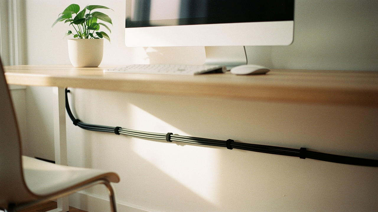 The rule of thumb here is to ensure you have 30–36 inches of vertical slack for any cord traveling from the floor to the desk [4]. I recommend grouping all these “traveling” cables into a single braided sleeve. This way, instead of five wires dangling, you have one neat “umbilical cord” that moves gracefully as the desk rises.